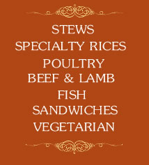 Appetizers Soup & Salad Entrees Drinks Desserts Lunch Specials Stews Specialty Rices Poultry Beef & Lamb Fishes Sandwiches Vegetarian Click to Download Menu